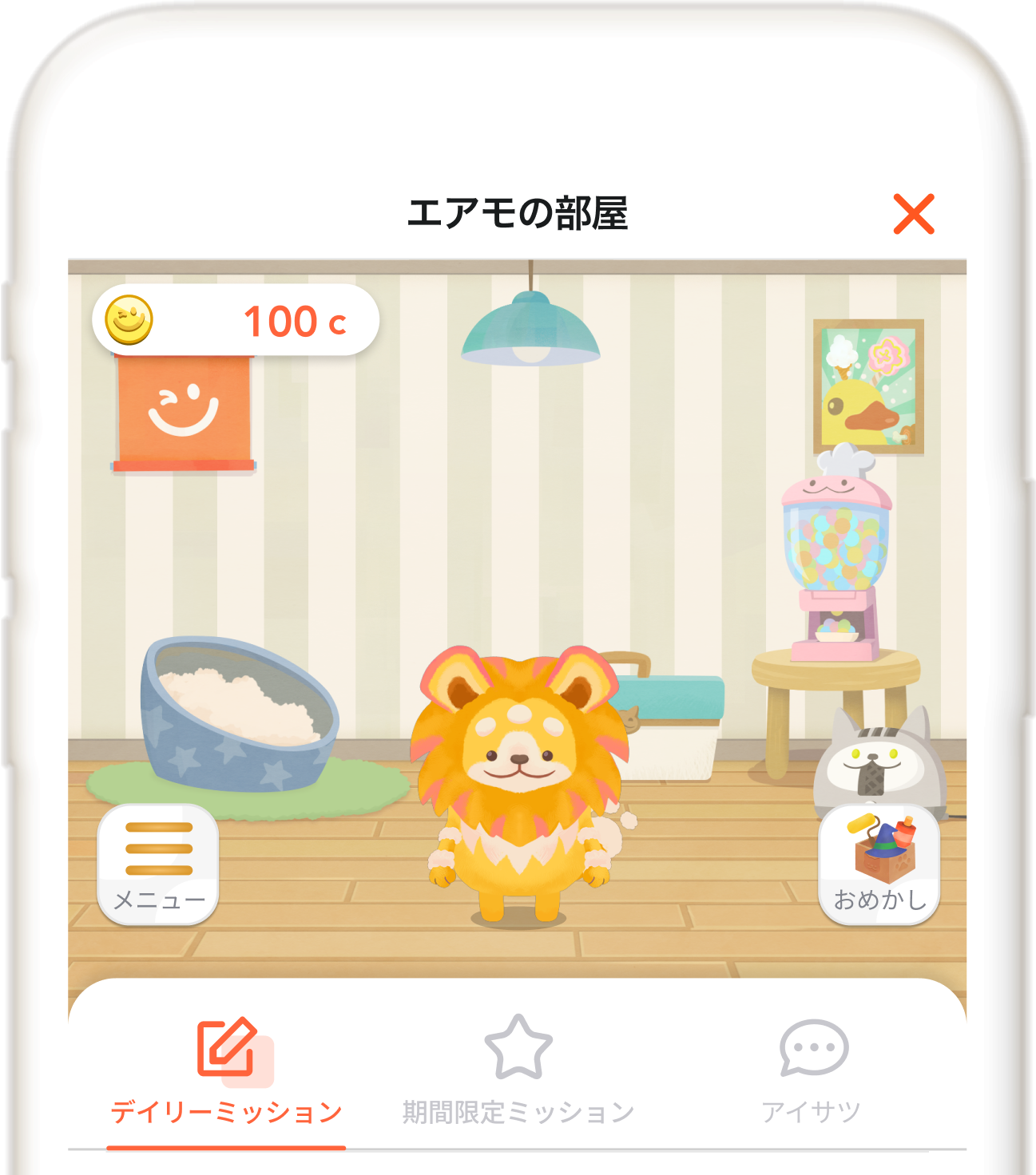健康に関する記事を読んだり、歩数や体重の入力などのミッションを達成すると、kencomコインや『エアモ』とコミュニケーションがとれるアイテムがもらえます。