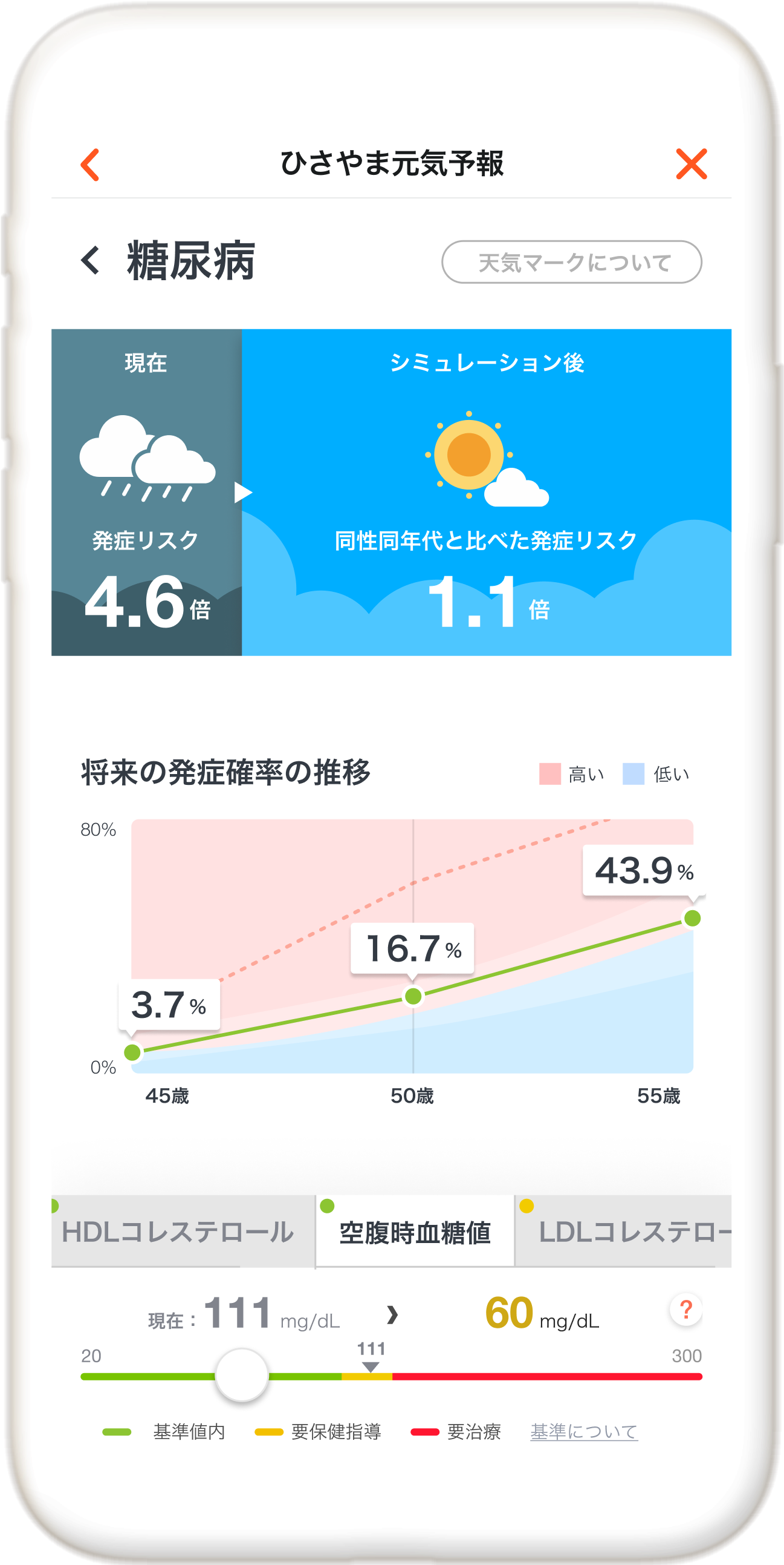 さらに「現在」の健診結果をもとに「将来」の生活習慣病の発症リスクや改善効果のシミュレーションができる『ひさやま元気予報』もご覧いただけます。(40歳以上)- ※健康データ閲覧には健診アクセス認証が必要です。利用登録方法をご確認ください。