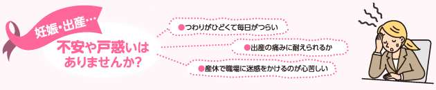 妊娠・出産・育児 | つわり、産休、出産の痛み、産後うつ、育児の不安・戸惑い、育児と仕事の両立など |